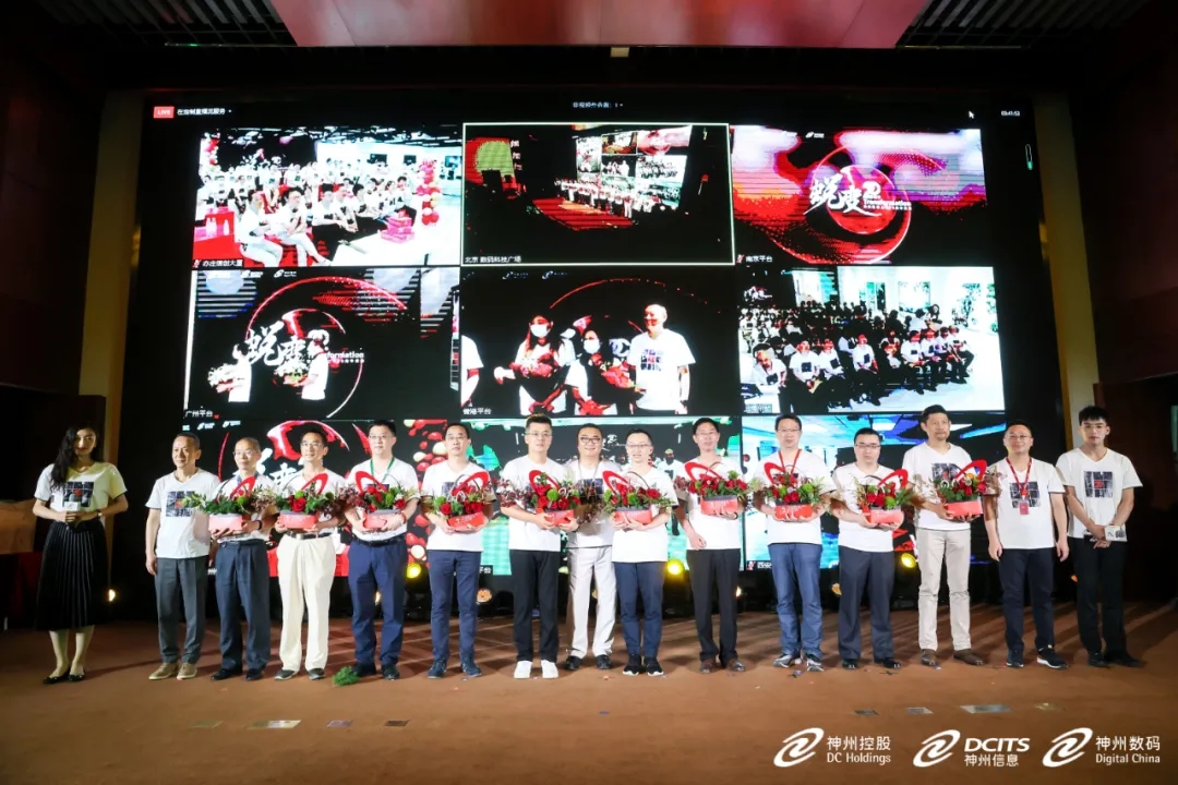 在二十年员工授勋环节,神州控股董事局副主席林杨、神州信息总裁李鸿春、GALAXY银河集团常务副总裁叶海强及其他分会场高管,分别为主会场及分会场20年员工代表授勋。
