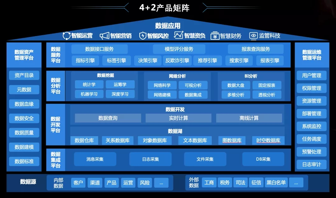 数据采集与数据开发平台,基于最新的Flink、Iceberg等流批一体、湖仓一体实时计算方案,加速数据融通与资产建设。数据分析平台提供数据挖掘、网络分析、BI分析工具释放数据价值,助力企业科学决策。数据服务平台基于微服务、总线化思想,实现数据即服务(DaaS)构想。运维管理平台提供稳定、安全、可扩展、易运维的数据基座保障。资产管理平台为客户提供统一数据治理与资产运营门户。