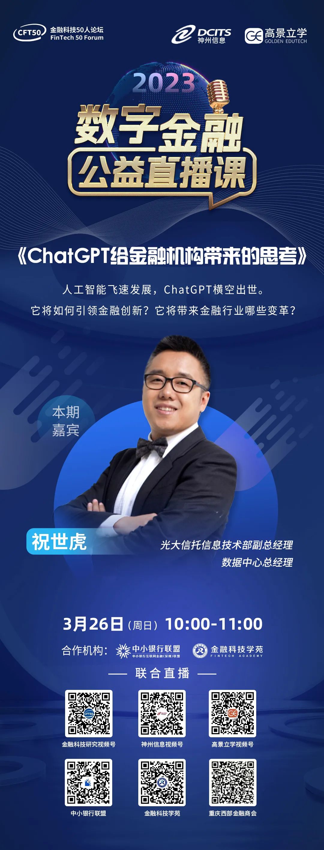 数字金融公益直播课 | 光大信托信息技术部副总经理、数据中心总经理祝世虎《ChatGPT给金融机构带来的思考》,明日开讲